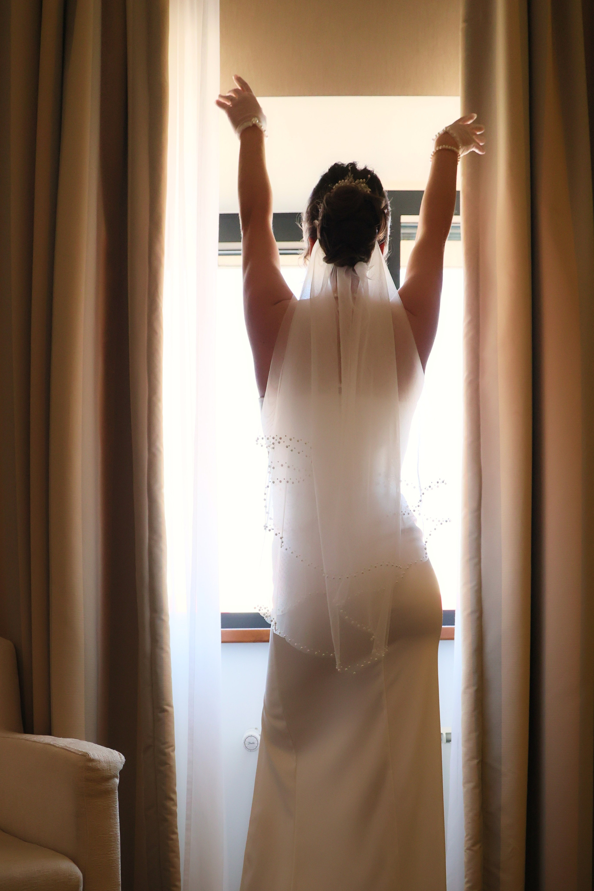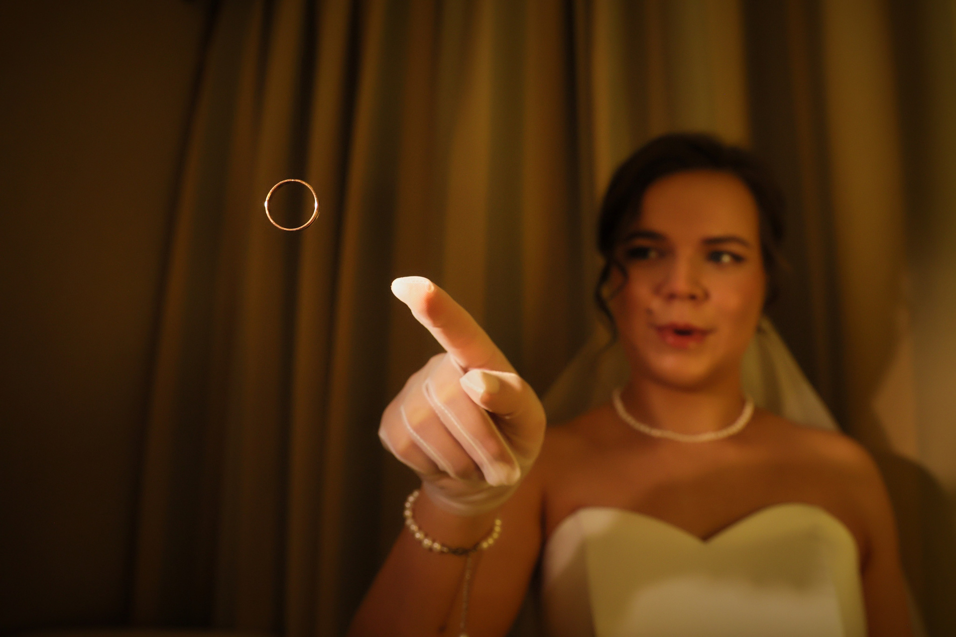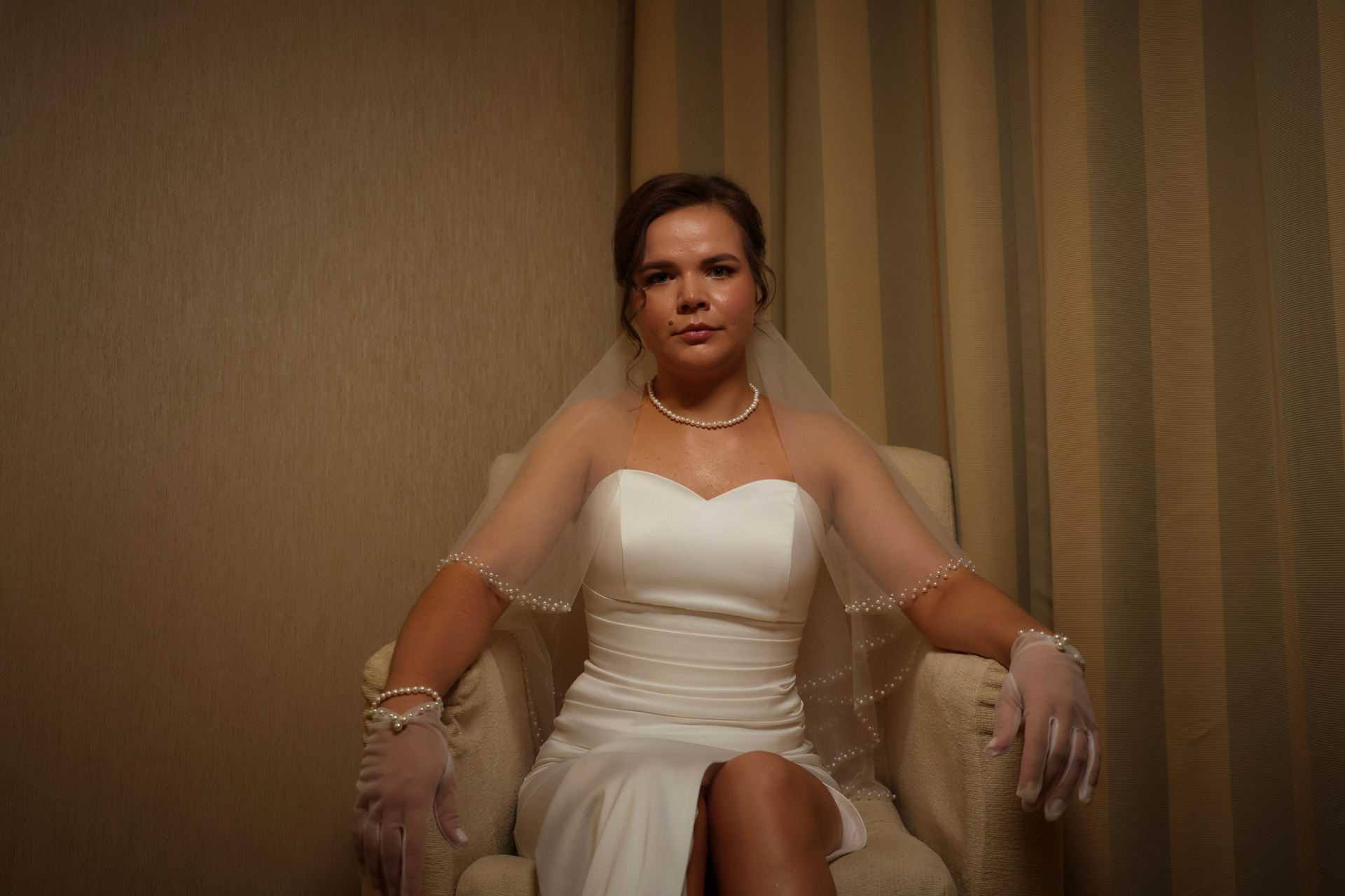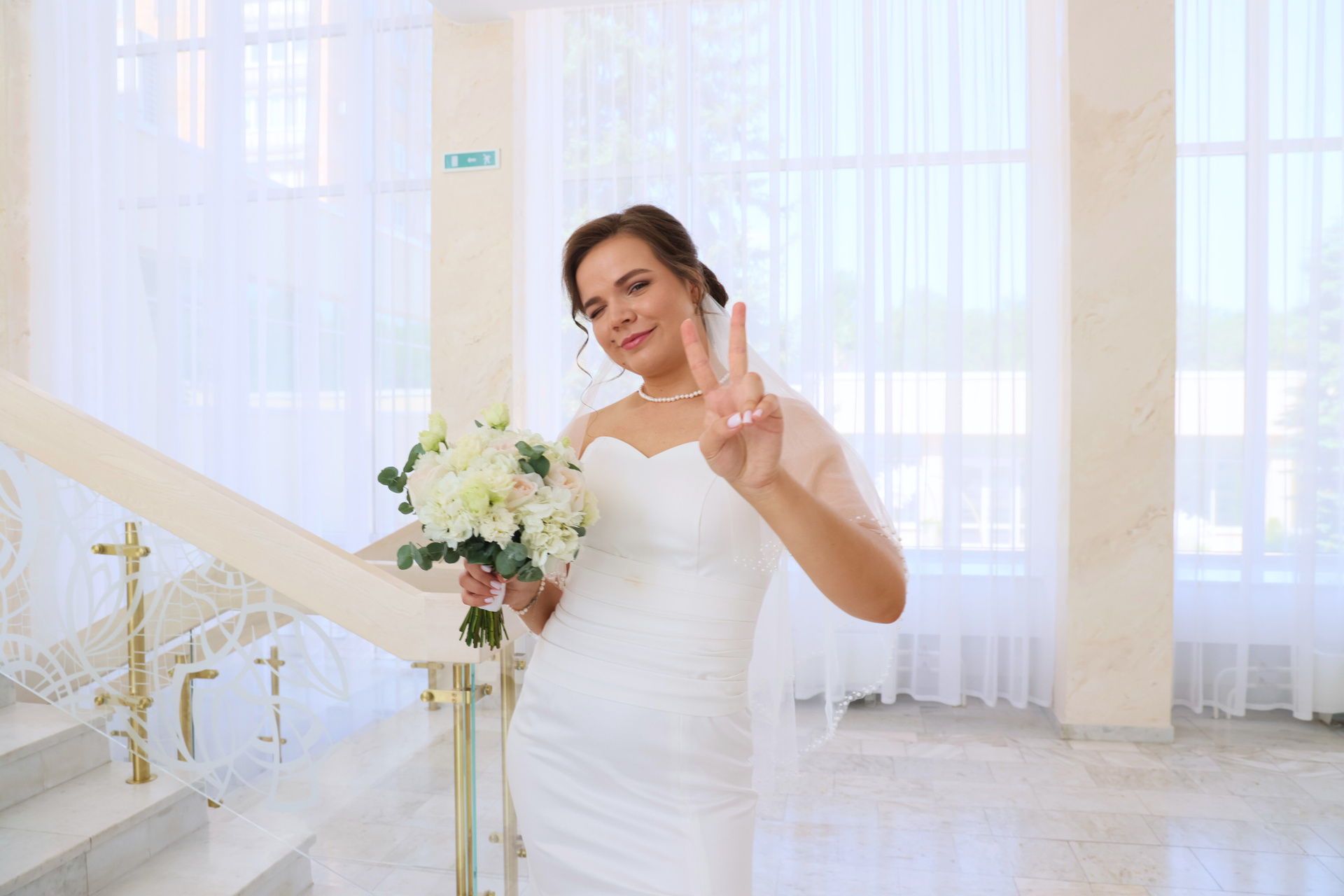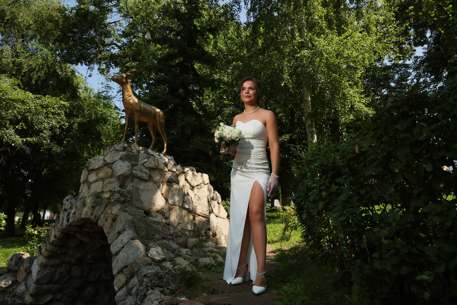 У невесты интересный макияж, корона, красивое платье с открытыми плечами и спиной. Тут подойдут креативные фотографии...